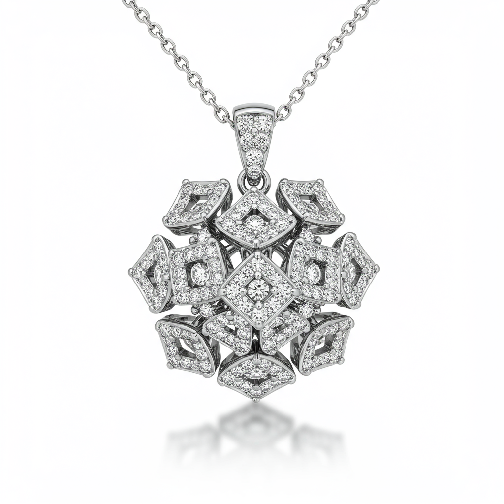 The new model necklace designs piece is an expression of refined modernity and brilliance. Crafted in lustrous 18KT white gold, this pendant features a dynamic, multi-layered cluster of perfectly matched VVS diamonds. The intricate setting maximizes light return, creating an illusion of a single large, breathtaking stone. This sophisticated design transitions effortlessly from daytime elegance to evening glamour, making it a timeless addition to any collection.