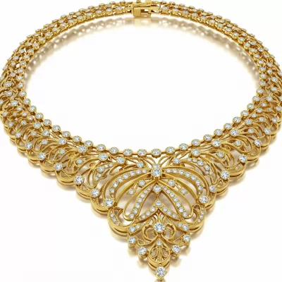 This magnificent traditional necklace design captures the essence of heritage jewelry, featuring intricate lattice work crafted in rich 18KT yellow gold. It is lavishly adorned with numerous VVS and VS quality, G-H color diamonds set in a breathtaking cascading pattern. This statement piece is meticulously engineered to provide exceptional brilliance and drape perfectly around the neckline. Ideal for grand occasions, it serves as a timeless heirloom reflecting unparalleled craftsmanship.