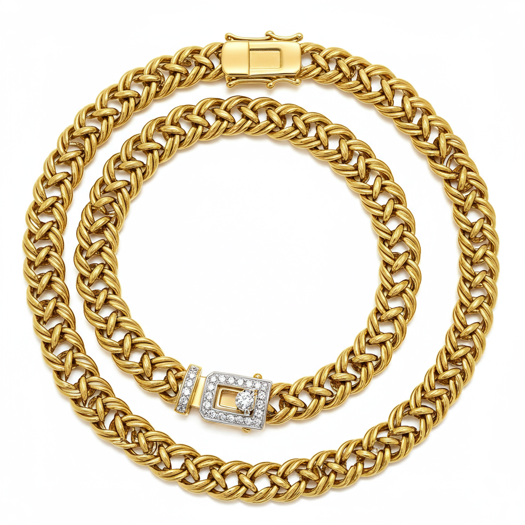 The 2 Pavan Heritage Gold Necklace is a magnificent embodiment of classic craftsmanship and enduring tradition. Forged in radiant 18KT yellow gold, this piece features intricate, robustly linked patterns that catch the light beautifully, offering a rich, fluid drape. Its substantial weight, approximately 16.5 grams, ensures a luxurious feel and makes it an ideal centerpiece for cultural celebrations and milestone events. This opulent chain necklace promises both striking visual presence and enduring quality, making it a true heirloom piece. Subtle VVS diamond accents add a touch of modern brilliance near the clasp.
