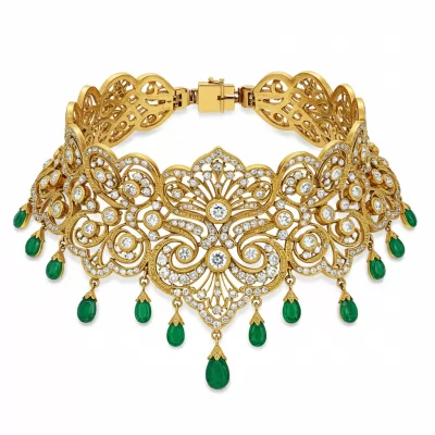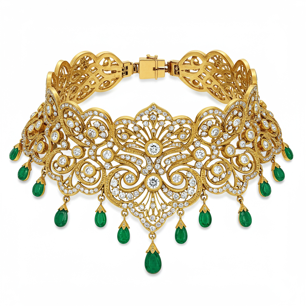 This magnificent antique necklace design embodies the grandeur of a bygone era, meticulously crafted in warm 18KT yellow gold. The intricate lattice work features elaborate milgrain detailing, supporting a constellation of brilliant round and marquise-cut diamonds. Its timeless silhouette drapes elegantly as a choker, making it a perfect heirloom piece for formal occasions. This piece is a true testament to classic European craftsmanship and unmatched luxury, designed to capture light and attention.