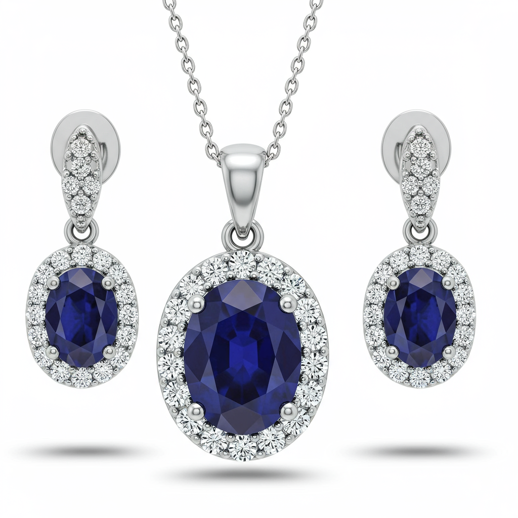 This exquisite blue stone necklace set epitomizes classic luxury, featuring a stunning pendant and matching earrings. Each piece showcases a magnificent, intensely hued oval blue sapphire at its center. A brilliant halo of micro-pave set VVS diamonds encircles the main stones, amplifying their brilliance and fire. Crafted in radiant 18KT white gold, this timeless ensemble is designed to make an unforgettable statement at any sophisticated event.
