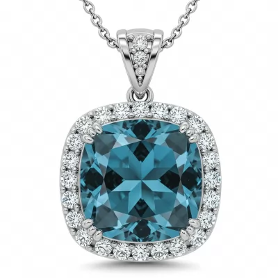 The Bluestone Diamond Necklace is a captivating masterpiece set in luxurious 18KT white gold. It features a stunning central cushion-cut London Blue Topaz, encircled by a brilliant halo of micro-pave set VVS diamonds. This design offers exceptional sparkle and deep color saturation, symbolizing depth and elegance. Suspended from a delicate yet strong chain, this piece provides a timeless statement of refined luxury.