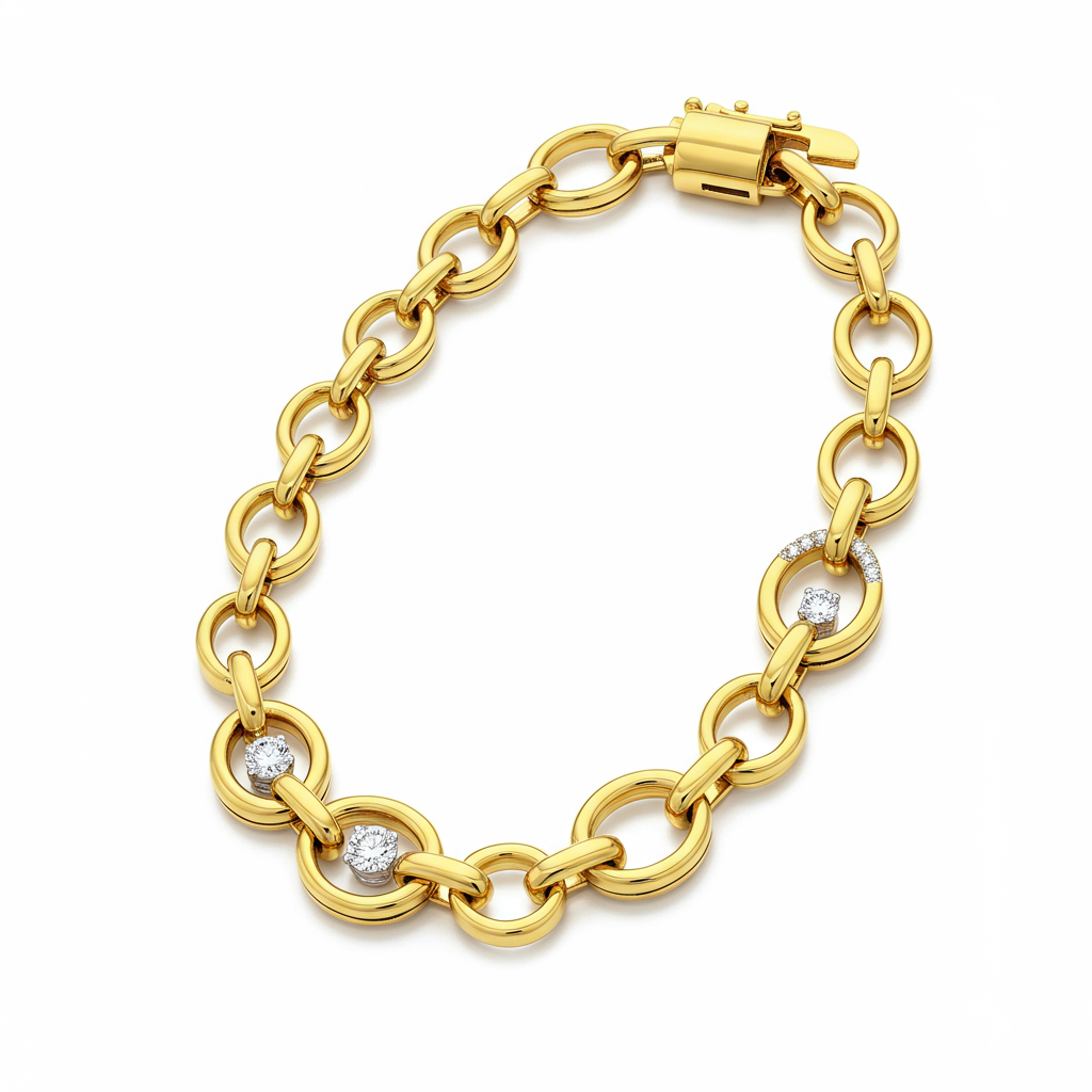 This fancy gold necklace epitomizes modern luxury, featuring interlocking links crafted from substantial 18KT yellow gold. The design incorporates delicate pave diamond settings along the central ornamental elements, catching light with every movement. Its adjustable length ensures a perfect fit, making it ideal for layering or wearing as a striking standalone statement piece. This masterpiece blends classic craftsmanship with bold contemporary geometry, guaranteeing timeless appeal and enduring value.