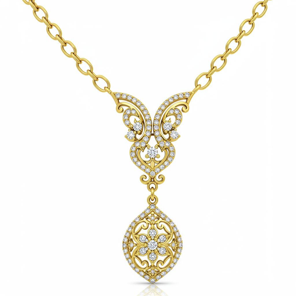This exquisite 18KT yellow gold bridal necklace embodies eternal elegance, perfect for a grand wedding celebration. It features a sophisticated, articulated design, meticulously set with brilliant VVS diamonds that cascade down the neckline. The centerpiece boasts a stunning floral motif, reflecting light from every angle, signifying timeless commitment. This luxurious piece is designed to be a treasured heirloom, capturing the joy and splendor of the most important day.