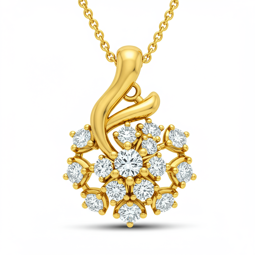 This exquisite 18KT yellow gold pendant necklace showcases brilliant craftsmanship, featuring a dazzling cluster of VVS round diamonds. The design balances modern geometry with classic elegance, ensuring maximum brilliance from every angle. Suspended on a fine gold chain, this piece is perfect for adding a touch of timeless luxury to any ensemble. It is an heirloom-quality accessory designed to capture and reflect light beautifully.