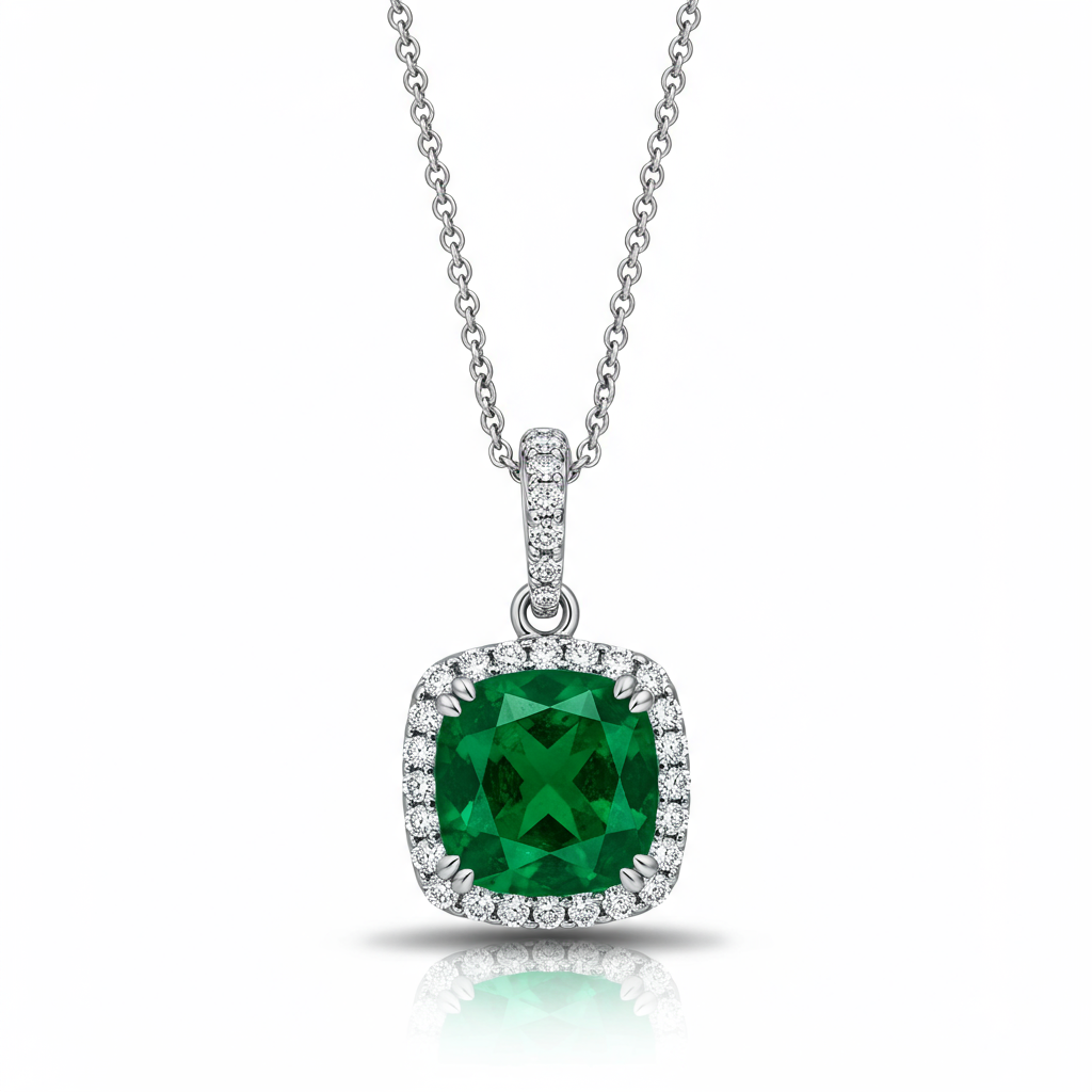 The green necklace is an embodiment of natural elegance and sophisticated craftsmanship. A breathtaking 3.50 carat cushion-cut Zambian Emerald sits as the centerpiece, radiating intense verdant hues. This primary stone is haloed by micro-pave VVS diamonds, set flawlessly in brilliant 18KT white gold. Suspended from a delicate diamond-accented chain, this piece offers timeless luxury and unparalleled sparkle, perfect for grand occasions.