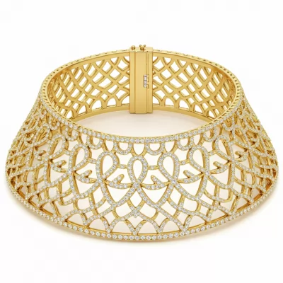 The Malabar Necklace is a breathtaking masterpiece, meticulously crafted to drape elegantly around the collarbone. Featuring a complex lattice structure of 18KT yellow gold, it symbolizes traditional opulence fused with contemporary design. Over a hundred VVS clarity diamonds are seamlessly set, capturing and reflecting light with unmatched brilliance. This choker is designed as a signature piece, perfect for monumental occasions and forming part of an heirloom collection.