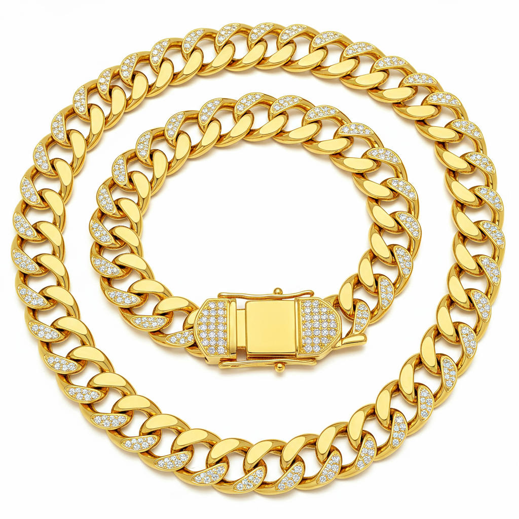 The 'mens gold chain necklace' epitomizes masculine luxury and impeccable craftsmanship. Forged in solid 18KT yellow gold, this substantial chain features classic Cuban links known for their durability and commanding presence. The high-polish finish reflects light flawlessly, ensuring unmatched brilliance. Subtle, paved VVS diamond accents on the custom box clasp provide a hidden layer of sophisticated detail. This piece is designed to be a timeless signature statement.