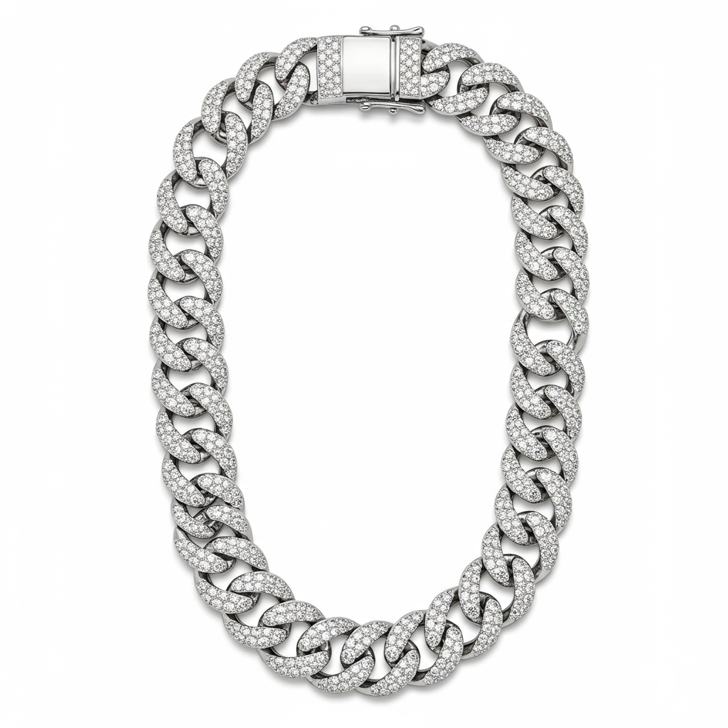 This magnificent men's necklace redefines luxury jewelry, crafted in solid 18KT white gold using the iconic Cuban link design. Each substantial link is meticulously micro-paved with hand-selected VVS round diamonds, totaling 5.50 carats of breathtaking brilliance. The substantial weight and flawless setting technique ensure a powerful statement of wealth and sophisticated taste. This piece is designed for the modern man who demands uncompromising quality and eternal style.
