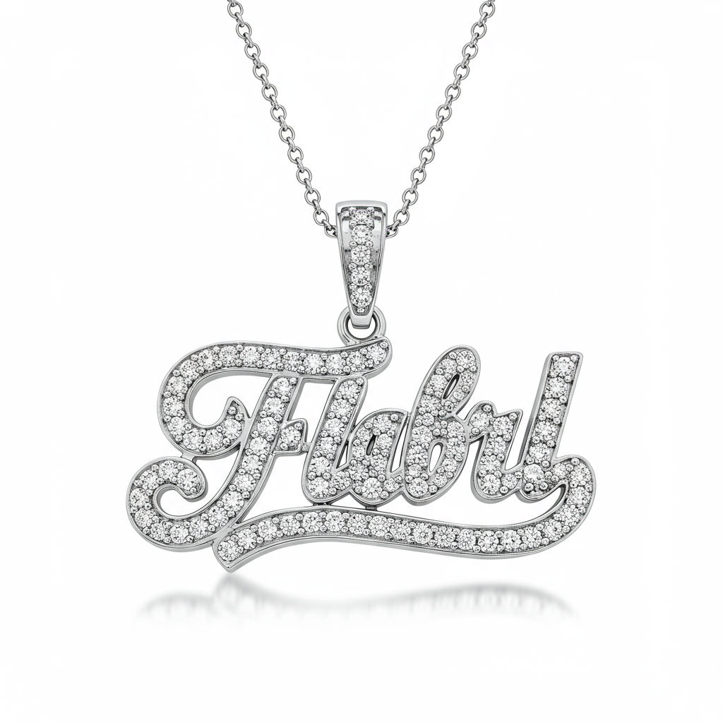 The Custom Name Pendant Necklace offers an intimate expression of individuality, meticulously crafted in radiant 18KT white gold. Each letter is delicately outlined and paved with brilliant VVS diamonds, creating a continuous stream of exceptional sparkle. This piece transforms a simple name into a sophisticated, wearable treasure that captures and reflects light from every angle. It serves as the ultimate personal statement, perfect for gifting or cherished daily wear.