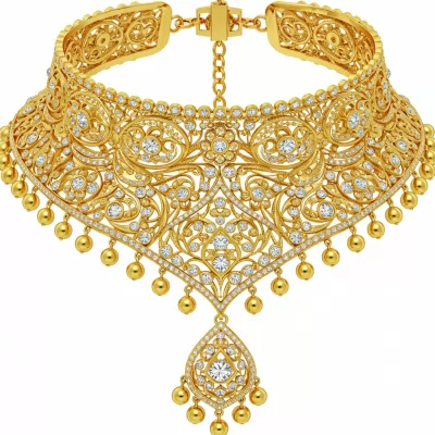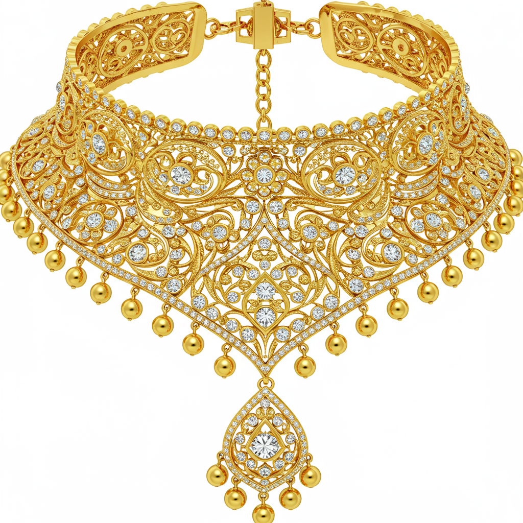 This stunning choker necklace is meticulously crafted in 18KT Yellow Gold, designed specifically to complement the grandeur of traditional sarees. Featuring an intricate, flowing pattern set with numerous brilliant-cut diamonds, it captures light with exceptional luminosity. The design offers a perfect balance of traditional aesthetics and modern precision, ensuring an elegant drape along the neckline. This heirloom piece is guaranteed to make a definitive statement at any high-profile event.