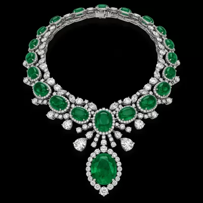 The Nita Ambani Emerald Necklace is a masterpiece of high jewelry, embodying unparalleled grandeur and regal elegance. This opulent piece features a dramatic array of cushion-cut and cabochon Zambian emeralds, meticulously framed by thousands of scintillating VVS natural diamonds. Crafted in lustrous 18KT white gold, the design flows with an intricate artistry, creating a breathtaking cascade of green and white fire. It stands as a testament to royal sophistication and timeless luxury, reserved for the most significant occasions.
