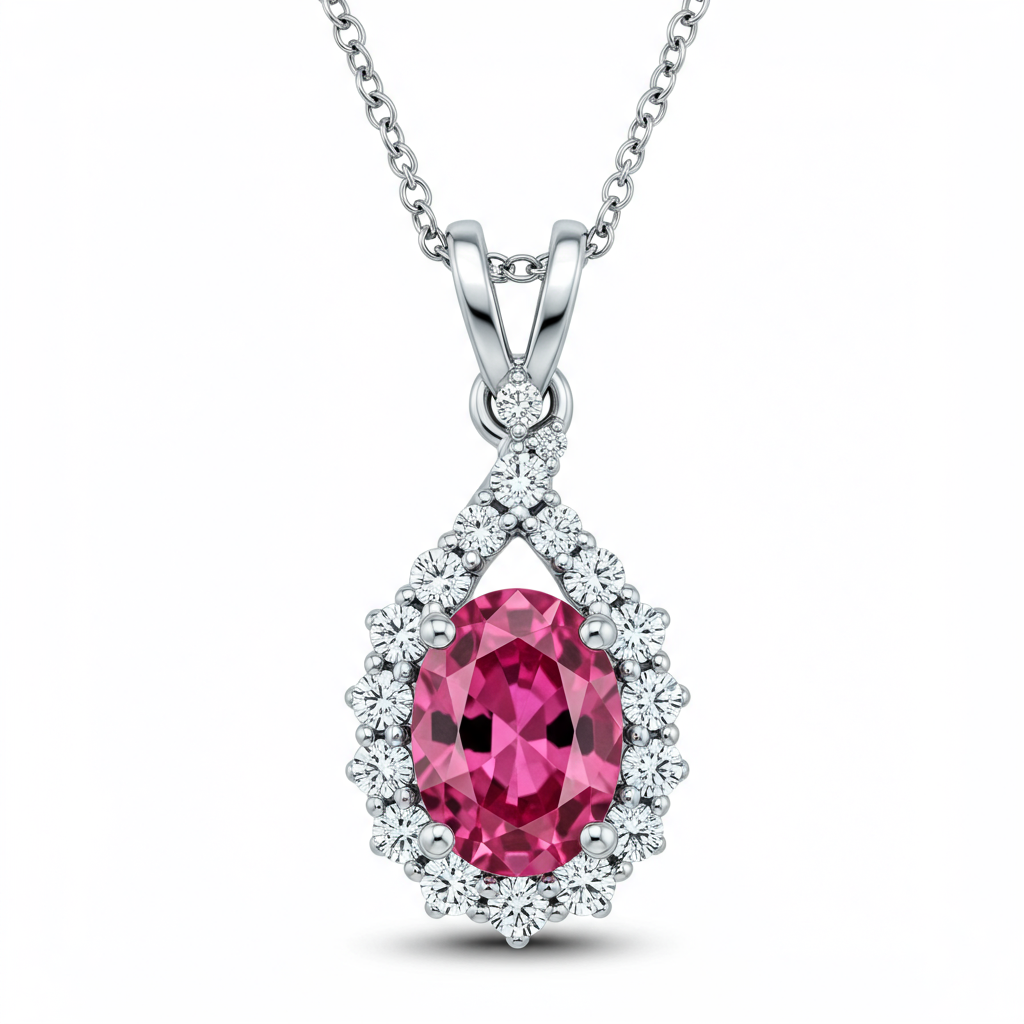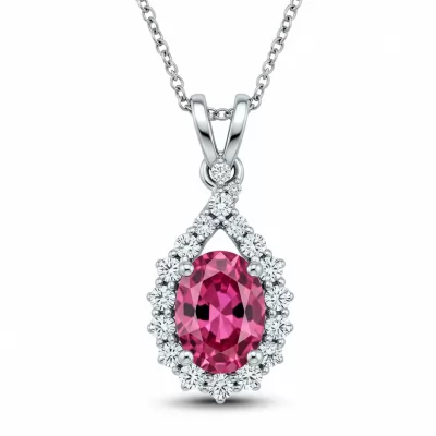 This captivating solitaire pendant features a vibrant central pink sapphire, meticulously cut into a radiant oval shape. The mesmerizing main stone is framed by a delicate halo of brilliant round diamonds, enhancing its color and fire. Set in lustrous 18KT white gold, the design is suspended from a fine chain, creating an elegant and striking presence. This necklace serves as the perfect statement piece for sophisticated evening wear or daily luxury.
