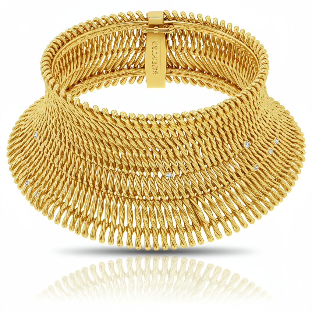 The Pure Gold Choker Necklace epitomizes enduring luxury through its substantial 18KT yellow gold construction. Designed to sit elegantly around the collarbone, this piece is defined by its impressive weight and smooth, high-polish finish, reflecting expert artisanal quality. It subtly incorporates small, brilliant VVS diamonds, adding a refined sparkle without distracting from the metal's rich luster. This weighty choker is a true statement investment, crafted for lasting heritage and bold elegance.