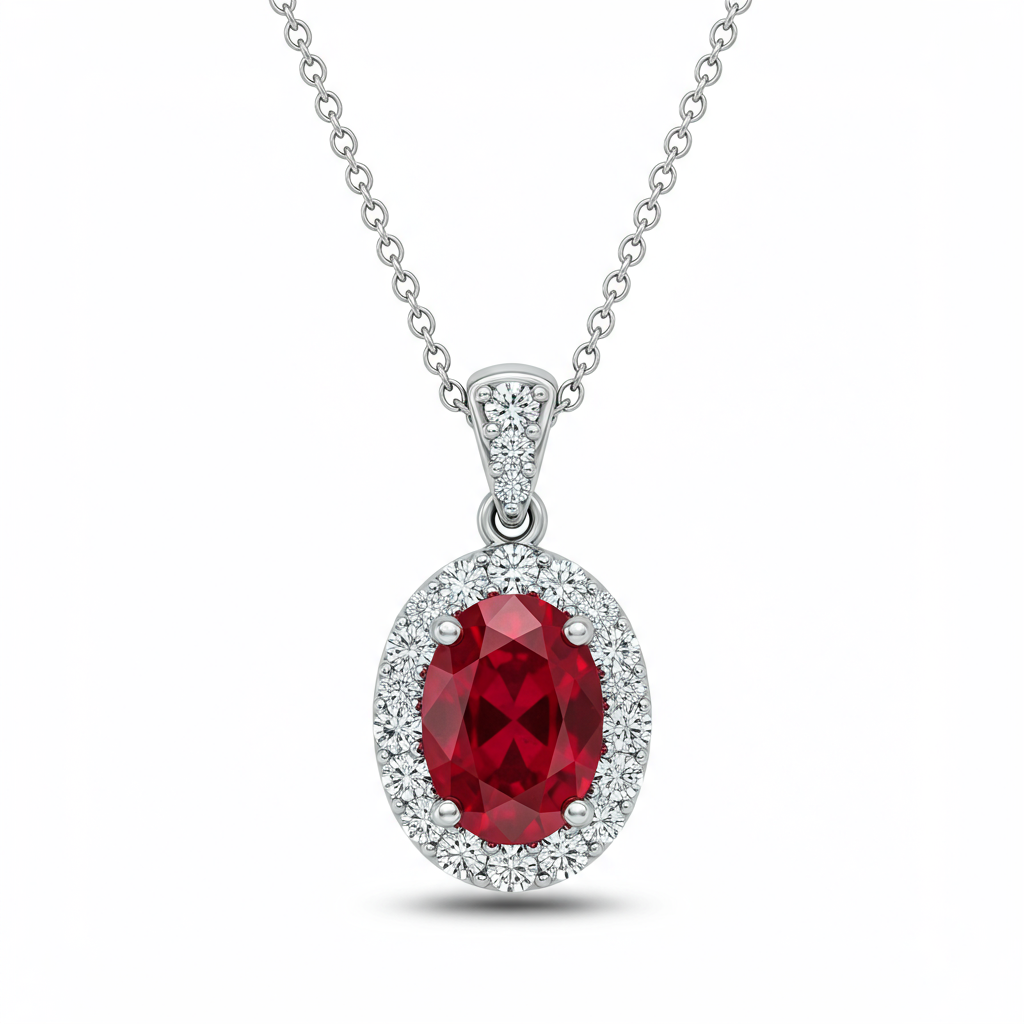 The Red Necklace is a masterpiece of vibrant color and pristine brilliance, focusing on luxurious contrast. A magnificent, deep red oval ruby is suspended within an 18KT white gold framework. Surrounded by a micro-pave setting of VVS accent diamonds, the pendant captures and reflects light from every angle, enhancing the central gem's fire. This exquisite piece defines timeless elegance, making it perfect for formal occasions or sophisticated daily wear.