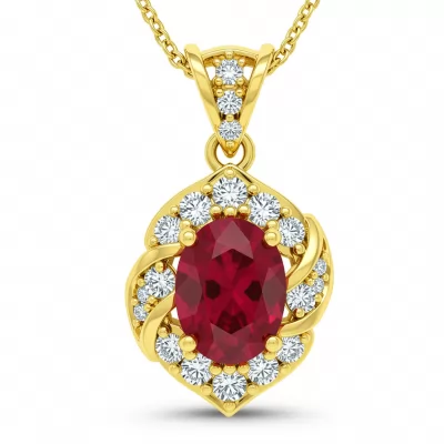This exquisite necklace features a vibrant, natural oval ruby as its centerpiece, haloed by brilliant cut diamonds. Expertly crafted in lustrous 18KT yellow gold, the design seamlessly harmonizes classic elegance with modern structural integrity. The rich, deep red hue of the primary ruby stone creates a striking and timeless contrast against the surrounding sparkling white diamonds. This luxurious piece is designed to make a sophisticated and unforgettable statement at any grand occasion, offering exceptional heirloom quality.