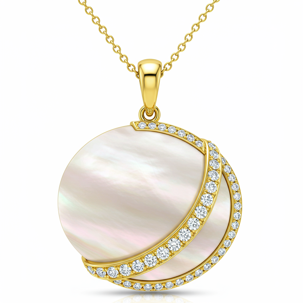 Embrace coastal elegance with the 'shell necklace,' a masterpiece crafted in luxurious 18KT yellow gold. The centerpiece is a substantial, custom-cut Mother of Pearl inlay that captures and reflects light with a luminous sheen, evoking the depth of the ocean. This exquisite shell element is meticulously framed by a brilliant halo of VVS G-H round diamonds set in detailed pave work. The design balances organic inspiration with high-jewelry precision, making it a timeless statement piece. Suspended from a delicate yet durable chain, this necklace offers sophisticated luxury for any occasion.