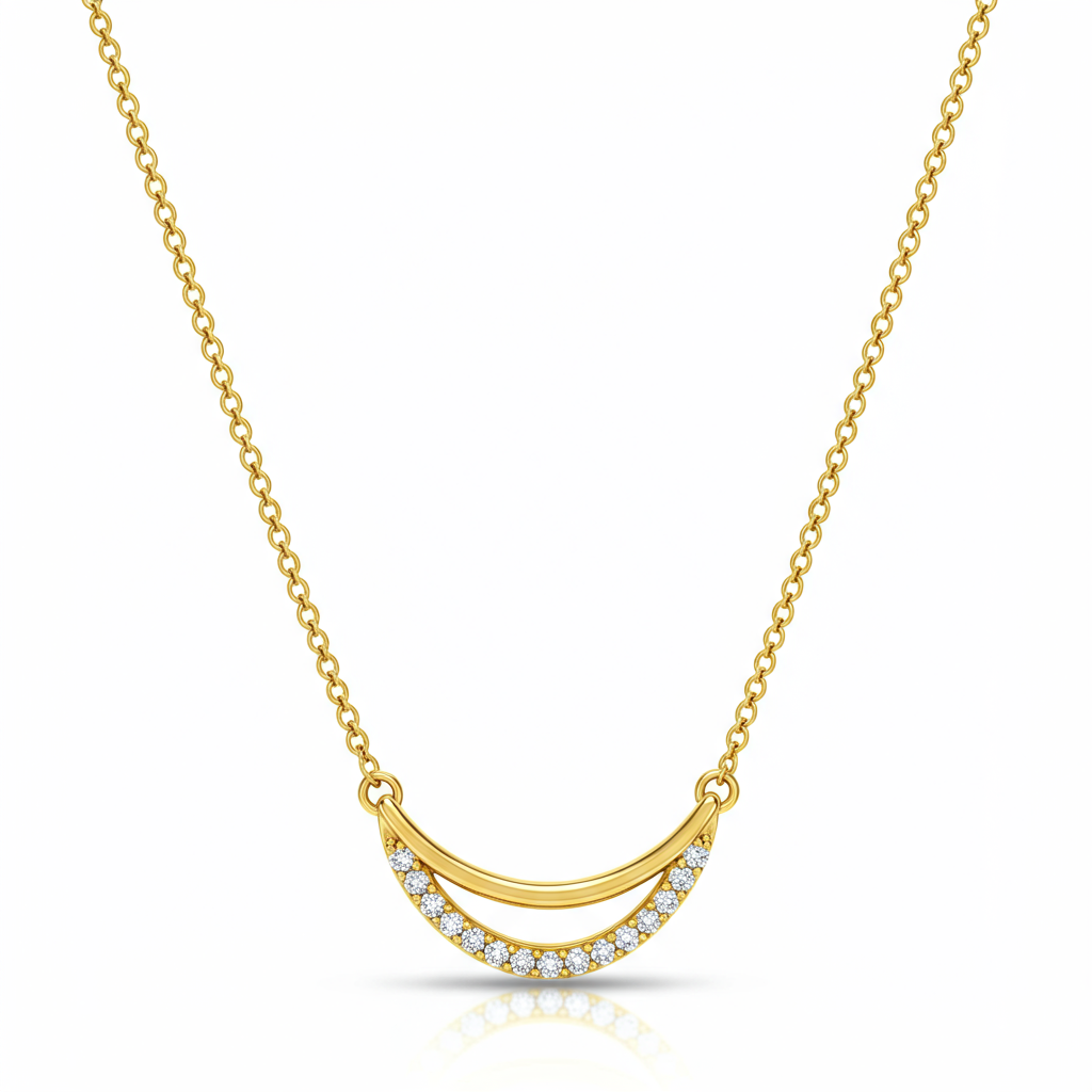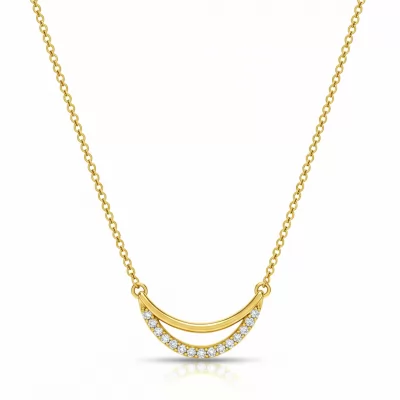 This exquisite short necklace captures modern elegance with its delicate form and radiant finish. Crafted in luminous 18KT yellow gold, the piece features a subtle curved element meticulously set with VVS clarity diamonds. Perfect for layering or as a singular statement, it adds a touch of sophisticated sparkle to any neckline. Its minimalist design is both timeless and contemporary, reflecting unparalleled craftsmanship.