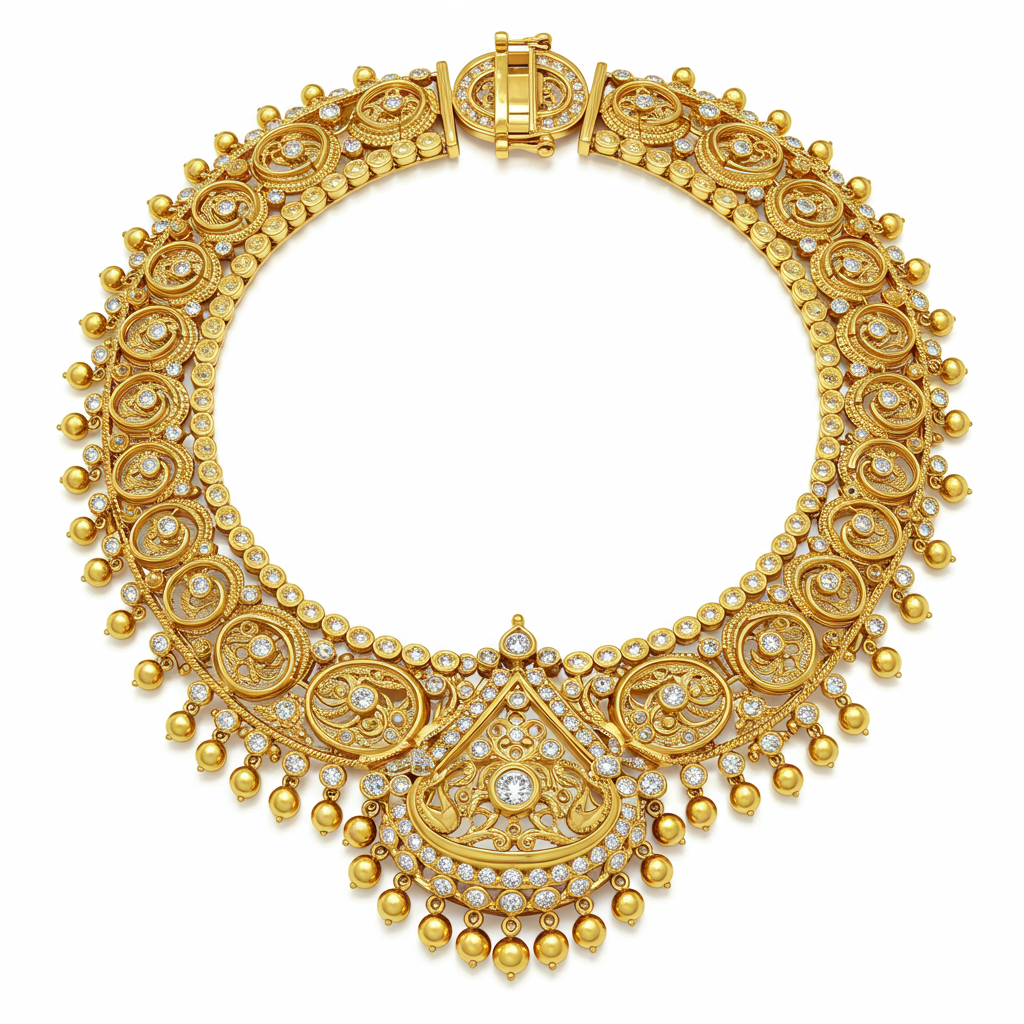 This magnificent traditional gold necklace embodies timeless heritage and exquisite craftsmanship. Forged in radiant 18KT yellow gold, its elaborate filigree work captures the intricate beauty of classical Indian jewelry design. The substantial net weight ensures a regal drape, making it the perfect statement piece for weddings and grand festive occasions. A true heirloom, this piece blends cultural significance with luxurious wearability.