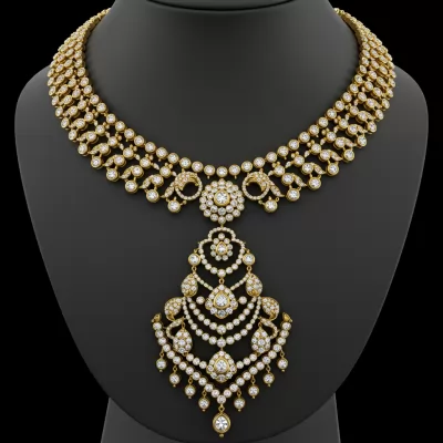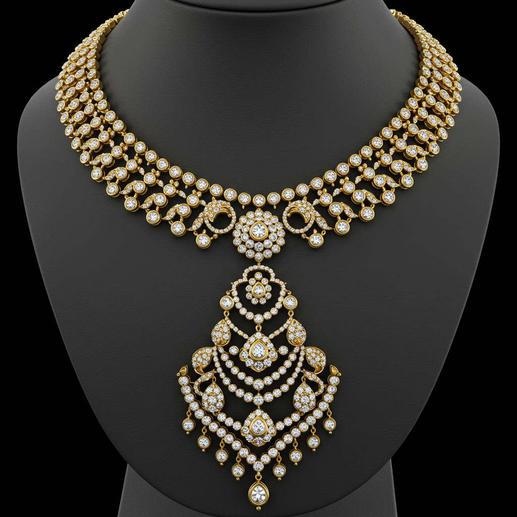 This magnificent traditional necklace is a testament to timeless craftsmanship, showcasing intricate yellow gold filigree work. It features cascading tiers of perfectly matched, brilliant-cut diamonds, creating a mesmerizing sparkle that commands attention. Designed to grace the neck for grand ceremonial occasions, the piece balances substantial weight with delicate detailing. The meticulous setting ensures every high-quality diamond captures the light flawlessly, making this an heirloom-quality jewel.
