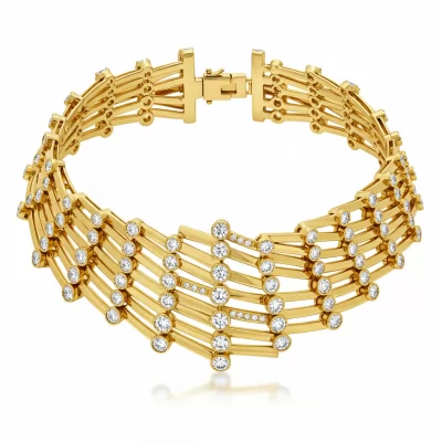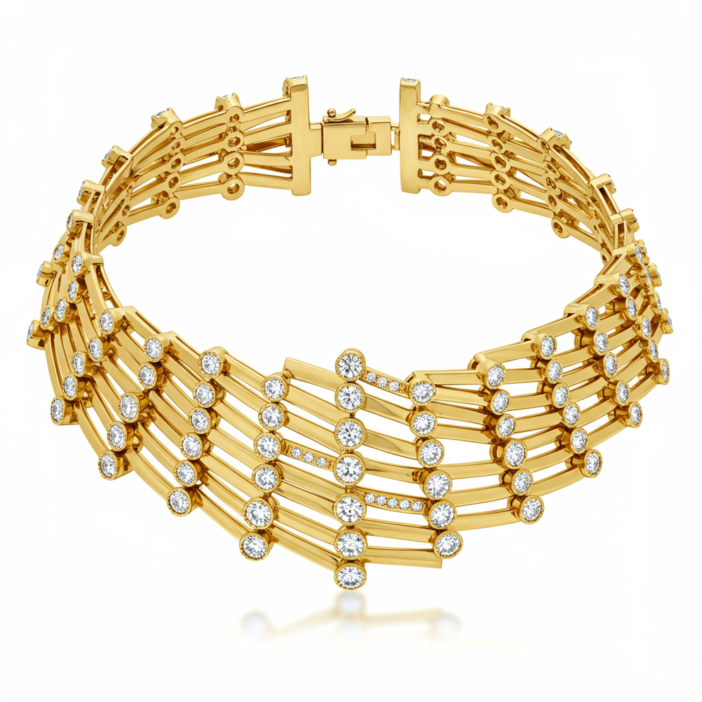 This exquisite wedding gold necklace epitomizes timeless elegance, crafted in luxurious 18KT yellow gold. Featuring a delicate yet impactful design, it showcases meticulously set VVS diamonds in a flowing formation that captures light from every angle. It is the perfect statement piece, designed to rest gracefully at the collarbone, symbolizing everlasting commitment and luxury. This heirloom-quality choker ensures a breathtaking presence on your special day.