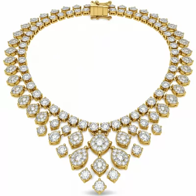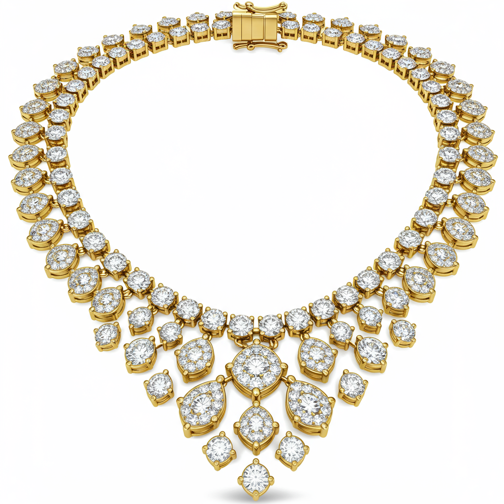 The 15 Gram Gold Statement Necklace is the epitome of classic luxury, meticulously crafted in radiant 18KT yellow gold. This piece features a sophisticated, articulate design that drapes elegantly around the neck, offering substantial yet comfortable wear. It is enhanced by precisely set VVS diamonds, creating a continuous line of breathtaking brilliance. Designed for grand occasions, this necklace seamlessly blends traditional weight and modern design aesthetics. It serves as a timeless heirloom piece, promising enduring magnificence.
