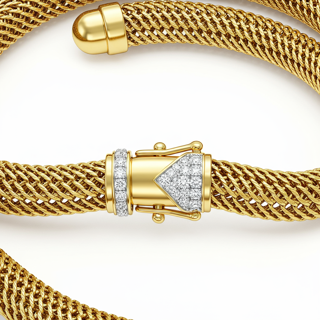 The Opulence Lattice Necklace embodies classic Indian grandeur updated for the modern collector. Crafted entirely in rich 18KT yellow gold, this substantial piece achieves a striking net weight approximate to two tolas, ensuring a commanding presence. Subtle diamond highlights are meticulously set within the intricate, flexible links, adding a sophisticated sparkle without overshadowing the inherent beauty of the high-purity gold. This design seamlessly blends traditional weight and contemporary artistry, making it a perfect heirloom piece for significant occasions.