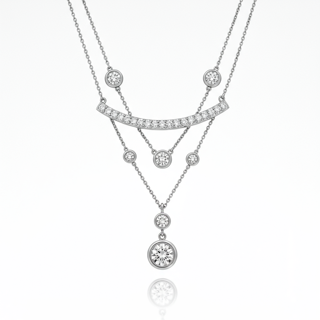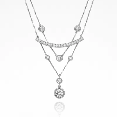 The 3 layer necklace embodies effortless elegance, featuring three distinct chains designed to sit perfectly upon the collarbone. Crafted in luminous 18KT white gold, each layer offers a unique texture: a delicate diamond-studded bar, a solitary bezel-set diamond drop, and a simple polished chain. This piece transitions seamlessly from sophisticated daywear to glamorous evening attire. Its contemporary design and superior craftsmanship make it a timeless addition to any fine jewelry collection.