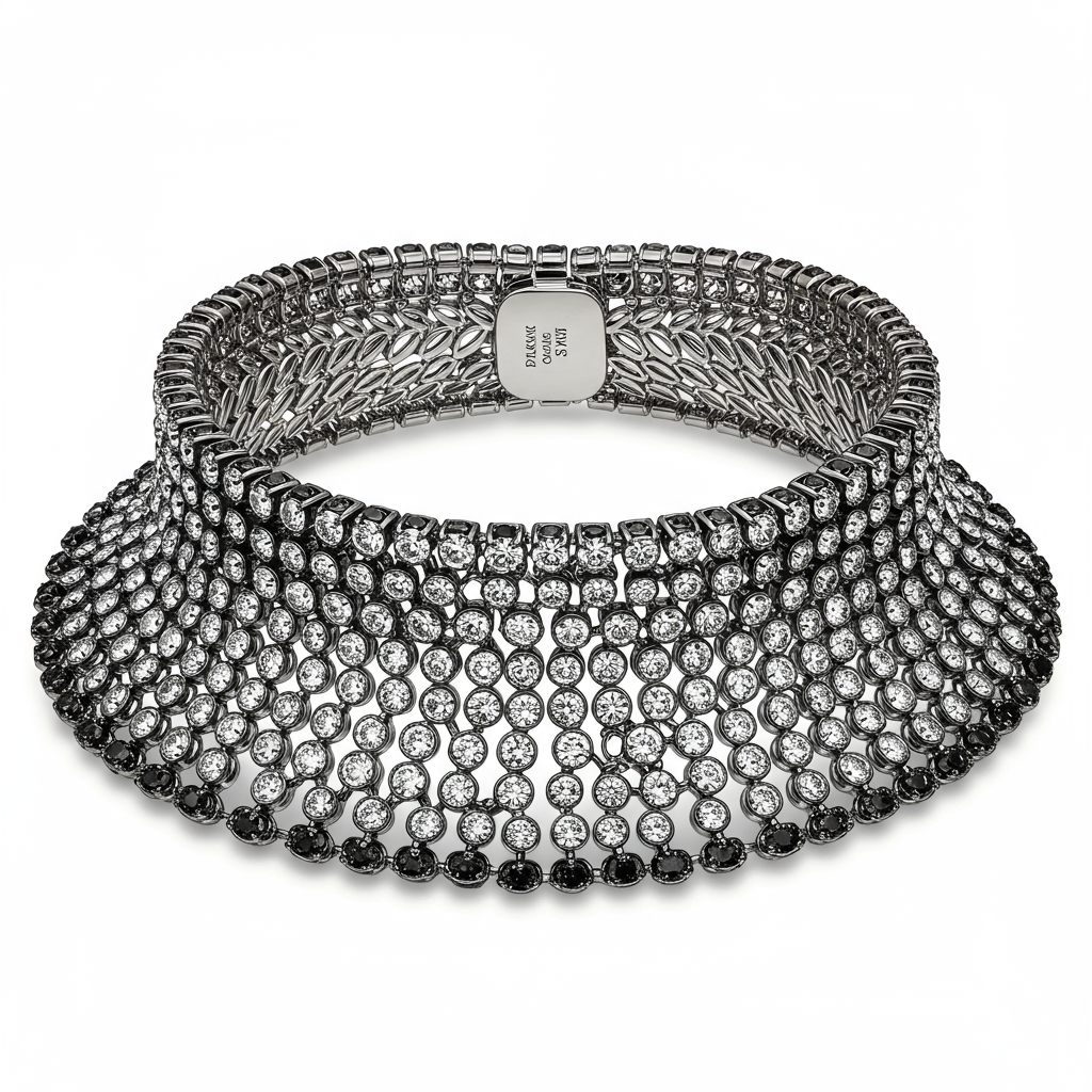 The 'black metal necklace' redefines modern elegance with its striking, sophisticated aesthetic. Crafted in 18KT gold, the piece is meticulously finished with a durable black rhodium plating, creating a dramatic canvas for brilliant light. A continuous stream of VVS round diamonds is expertly set along the articulated chain, ensuring maximum fire and scintillation against the dark metal backdrop. This choker-style necklace offers a bold, contemporary statement, perfect for high-fashion events and luxurious evenings.