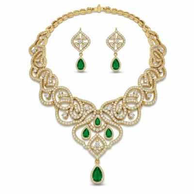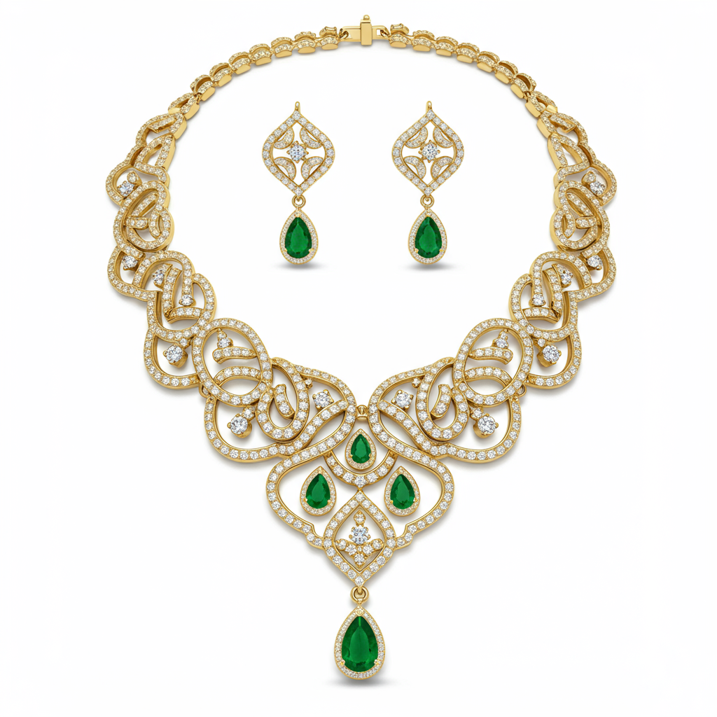 This opulent bridal set features a traditional short necklace and a complementary long haram, meticulously crafted for the grandest wedding ceremonies. The intricate design showcases detailed filigree work interspersed with high-brilliance VVS diamond clusters, capturing the essence of timeless South Asian bridal elegance. Each piece is set in rich 18KT yellow gold, creating a stunning visual contrast that illuminates the wearer. This masterpiece symbolizes heritage and luxury, ensuring the bride is the epitome of sophistication on her special day.