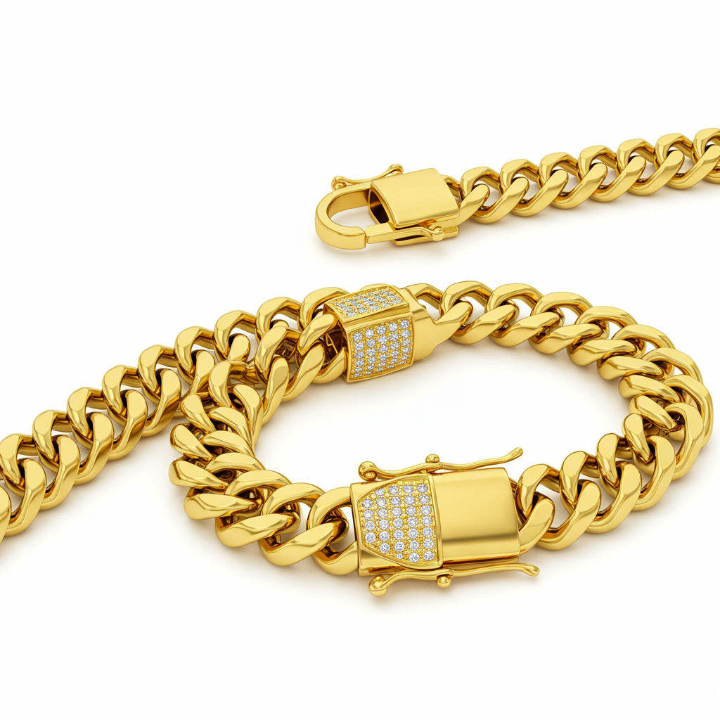 This distinguished men's chain is crafted from substantial 18KT yellow gold, offering a commanding presence and exceptional durability. Featuring a classic, tightly-woven solid curb link design, it reflects light with a rich, continuous sheen. The superior craftsmanship ensures a comfortable drape while maintaining a masculine weight and premium feel. Secured by a robust box clasp accented with subtle VVS diamonds, this necklace is the epitome of timeless luxury jewelry for the modern man.