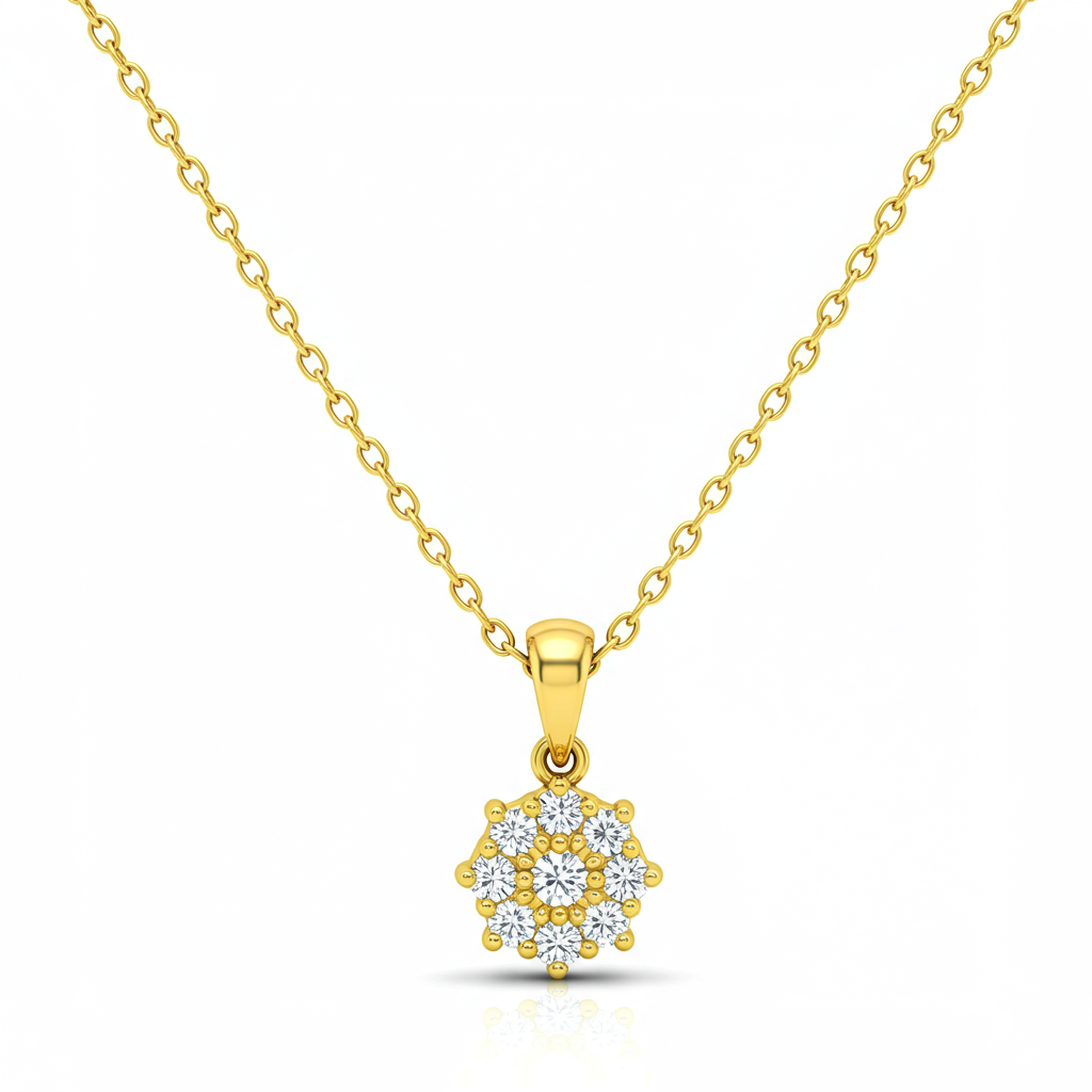 The Short Gold Necklace is an expression of understated luxury, meticulously crafted from radiant 18KT yellow gold. This piece features a delicate, fine-link chain that rests elegantly just below the collarbone, offering a sophisticated and contemporary look. At its center, a small cluster of brilliant round diamonds captures the light with exceptional fire and sparkle, guaranteeing maximum brilliance. Perfect for layering with longer pieces or wearing solo, this necklace provides timeless sophistication and daily glamour.
