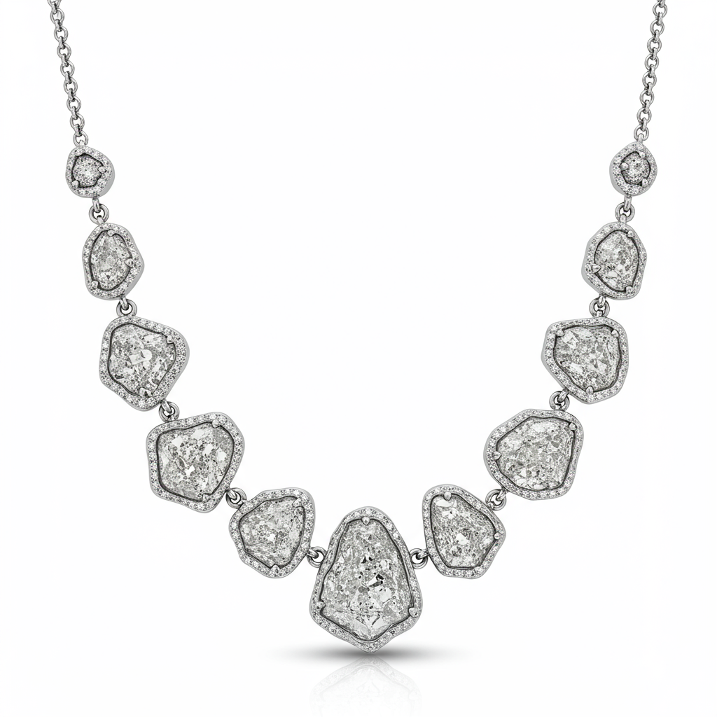 This extraordinary necklace celebrates raw, natural beauty by featuring a stunning cluster of high-grade uncut diamonds. Each organically shaped stone is meticulously set in polished 18KT white gold, creating a dramatic, contemporary focal point. The main pendant is balanced by a delicate chain accented with brilliant round diamonds, ensuring magnificent sparkle from every angle. It is a powerful statement piece designed for the connoisseur who appreciates natural luxury and sophisticated design.