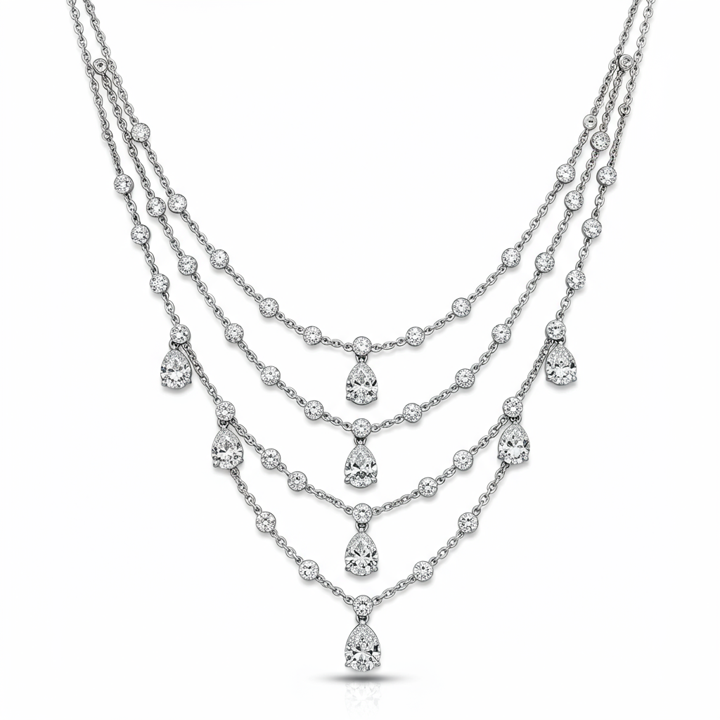 This exquisite bridal diamond necklace embodies timeless elegance and unmatched brilliance, designed to be a centerpiece of your wedding attire. Crafted in opulent 18KT white gold, the delicate festoon structure features cascading tiers of perfectly matched, high-grade diamonds. This heirloom piece is engineered to sit flawlessly, illuminating the décolletage with breathtaking sparkle. It is the ultimate statement accessory for a monumental wedding celebration.