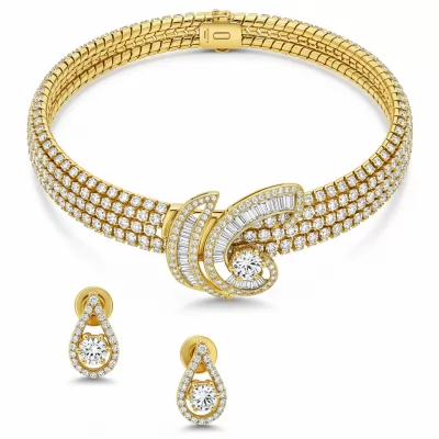 The Gold Choker Necklace Set is a masterpiece of contemporary elegance, designed to command attention. Crafted in brilliant 18KT yellow gold, this flexible structure drapes gracefully around the collarbone. It features meticulously set VVS diamonds that capture light from every angle, creating a spectacular shimmer. This luxurious set, which includes matching components, is the quintessential choice for high-fashion events and sophisticated galas. It symbolizes unmatched prestige and refined taste.