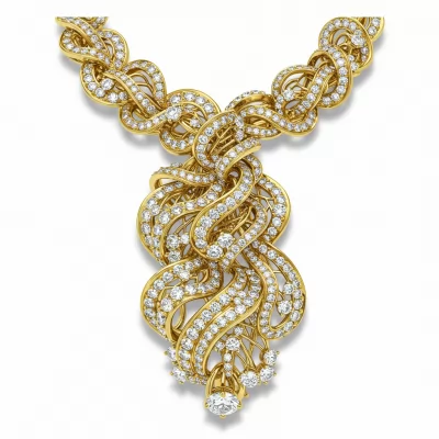 This magnificent statement necklace is meticulously crafted from 18KT yellow gold, achieving an impressive presence designed to command attention. The fluid, dimensional silhouette utilizes intricate clusters of VVS brilliant-cut diamonds, maximizing light return and exceptional sparkle. With a substantial net weight nearing 30 grams, the piece offers both luxurious drape and heirloom quality. This design seamlessly marries traditional South Asian opulence with refined modern craftsmanship, creating an unforgettable centerpiece for any grand occasion.