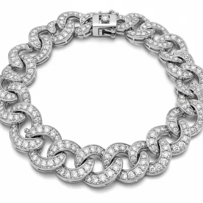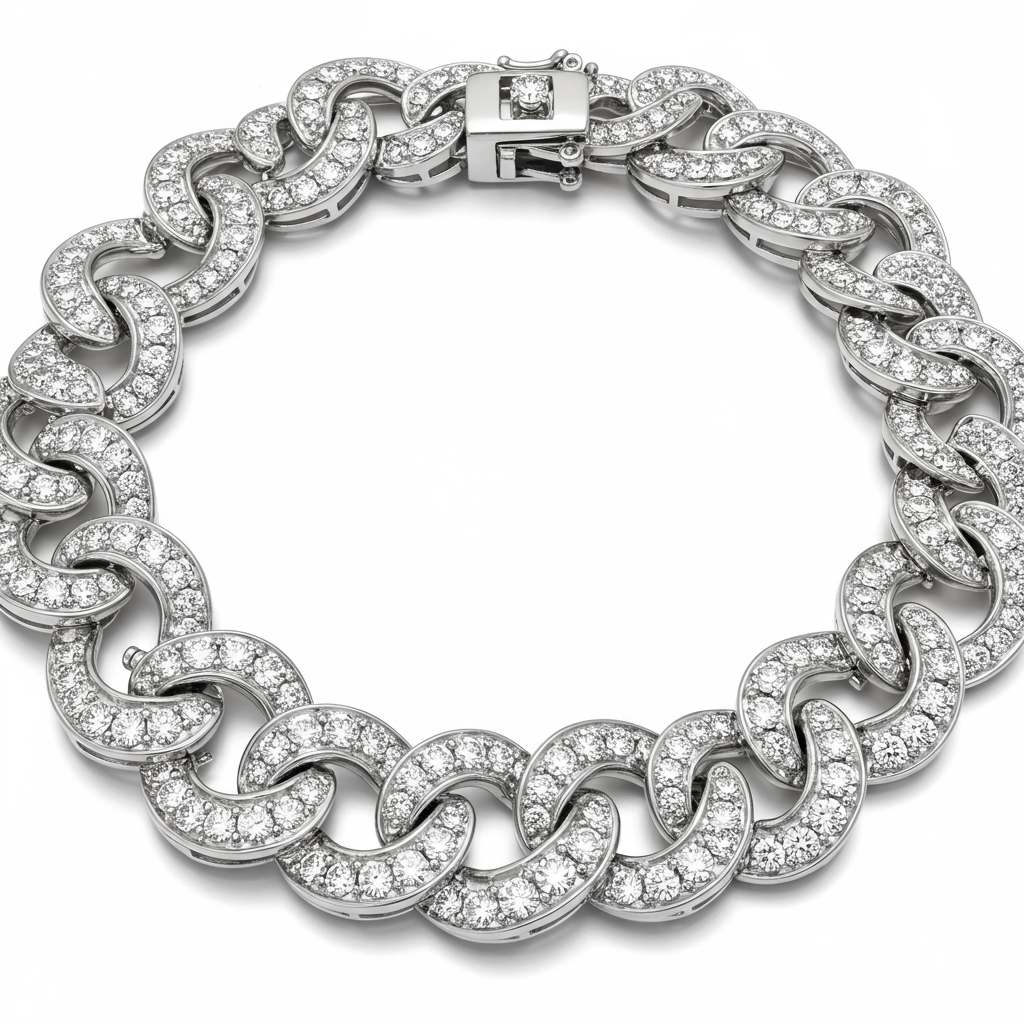 A magnificent statement piece, the Malabar Diamond Necklace showcases exceptional craftsmanship and radiant brilliance. This flowing link design features intricate diamond clusters set in polished 18KT white gold, capturing light from every angle. It represents a fusion of traditional luxury and contemporary design, offering unmatched elegance. Perfect for grand occasions, this necklace ensures a captivating presence and heirloom quality.