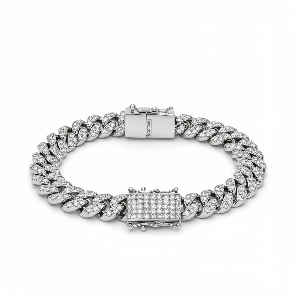 This exceptional men's Cuban link chain redefines masculine luxury with its robust architectural design. Crafted in luminous 18KT white gold, each substantial link is meticulously set with brilliant VVS diamonds, creating a continuous line of blinding scintillation. The heavy gauge and secure box clasp ensure durability while providing a commanding presence suitable for high-end styling. This piece is the ultimate statement of sophisticated craftsmanship and enduring value, perfect for the modern connoisseur. It features a meticulously engineered structure designed for comfort and longevity.