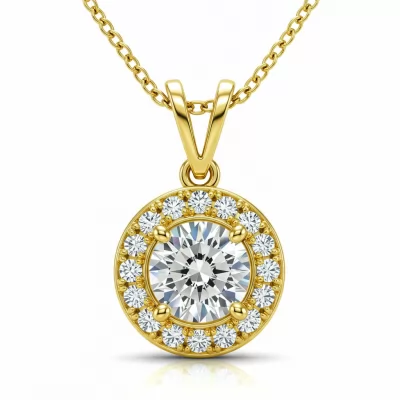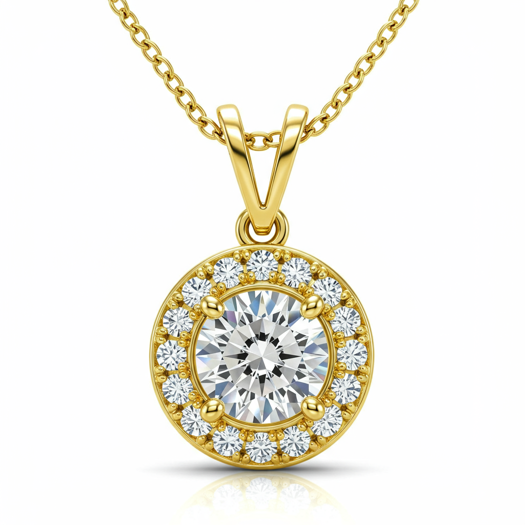 This exquisite 18KT yellow gold halo necklace radiates timeless elegance, featuring a brilliant center diamond encircled by a meticulously set micro-pave diamond frame. The sophisticated design maximizes light return, ensuring dazzling brilliance with every movement. Suspended from a delicate gold chain, this piece is perfect for marking significant milestones or elevating everyday luxury. It embodies superior craftsmanship and refined taste, making it an instant heirloom.