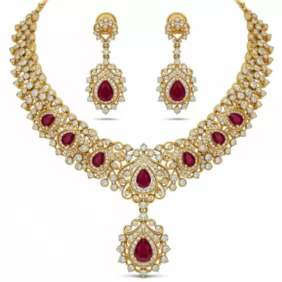 This exquisite Tanishq inspired necklace set radiates regal elegance, featuring a magnificent cascade of brilliant-cut diamonds complemented by vibrant ruby accents. Crafted in rich 18KT yellow gold, the design harmoniously blends traditional Indian motifs with modern sophistication. The coordinating drop earrings ensure a complete and unforgettable ensemble suitable for grand occasions. This set is a true testament to masterful craftsmanship and timeless luxury, capturing light with every movement.