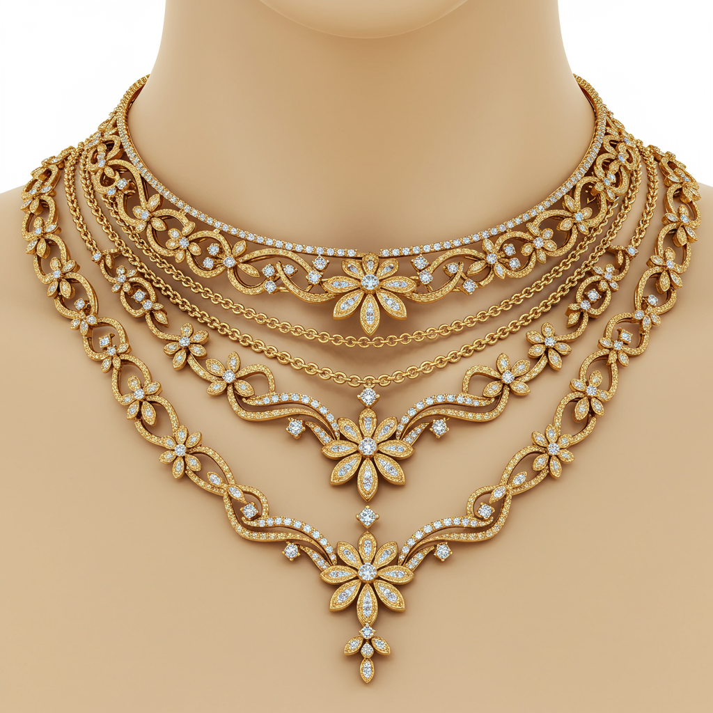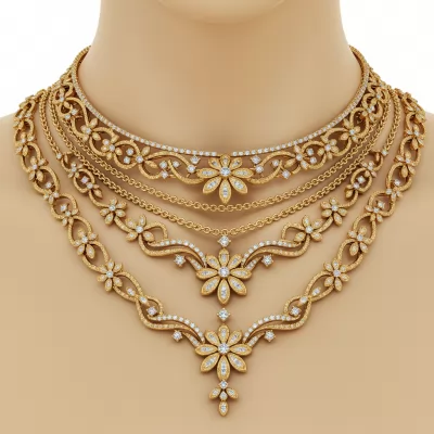 This exquisite heritage necklace, weighing approximately 20 grams, captures the elegance of traditional Indian design blended with modern flair. Crafted in radiant 18KT yellow gold, the piece features intricate filigree work forming a delicate, layered pattern ideal for festive occasions. Subtle diamond accents add a sophisticated sparkle without overpowering the stunning metal craftsmanship. This design is a timeless investment piece, reflecting luxury and cultural legacy.