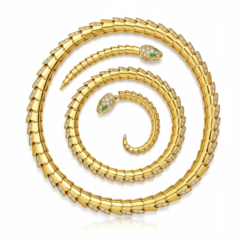 The iconic Serpenti necklace captures the captivating movement of a coiled snake, embodying seduction and sophisticated glamour. Crafted in luxurious 18KT yellow gold, this highly flexible design wraps elegantly around the neck, creating an unforgettable statement. The entire serpentine body is meticulously paved with brilliant VVS G-H diamonds, totaling 8.50 carats of extraordinary sparkle. This dramatic piece celebrates timeless Italian craftsmanship and bold, architectural jewelry design.