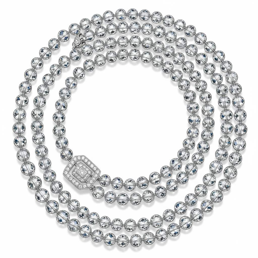 Experience timeless elegance with this exquisite Crystal Beads Necklace, meticulously crafted to showcase the brilliant clarity of premium crystals. This stunning piece features a uniform strand of perfectly spherical beads, offering remarkable sparkle and sophisticated movement. The necklace is secured by a luxurious 18KT white gold clasp, subtly embellished with high-grade VVS round diamonds. Perfect for layering or as a dazzling standalone statement, this piece embodies classic luxury and refined taste.