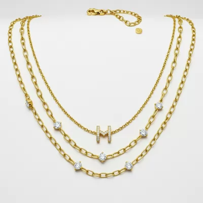 The 'h and m necklaces' set embodies modern elegance through its artful layering of chains. Crafted in lustrous 18KT yellow gold, this piece features delicate links accented by strategically placed micro-pave diamond elements. This versatile design offers effortless sophistication, transitioning seamlessly from day wear to evening attire. It is the definitive statement piece for contemporary luxury collectors seeking adaptable style.