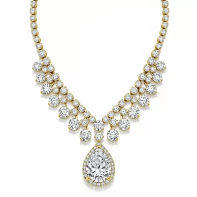This exquisite piece captures the timeless elegance associated with traditional Indian craftsmanship. Crafted in luminous 18KT yellow gold, the design features a central pear-shaped motif highlighted by brilliant, meticulously set diamonds. It offers a luxurious yet wearable statement, perfect for grand occasions or as a generational heirloom. The intricate detailing ensures exceptional light reflection and unparalleled sparkle, reflecting the heritage of fine jewelry design.
