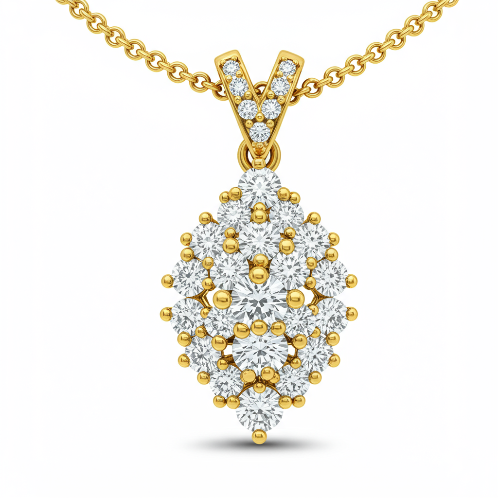 This exquisite piece captures the elegance of 2020 design trends, featuring a delicate chain supporting a brilliant diamond cluster pendant. Crafted in luxurious 18KT yellow gold, the design utilizes precise settings to maximize light performance. The central arrangement of VVS diamonds creates an impactful brilliance, perfect for both daily wear and sophisticated evening attire. This necklace seamlessly blends traditional luxury with modern aesthetics, offering a timeless statement piece.