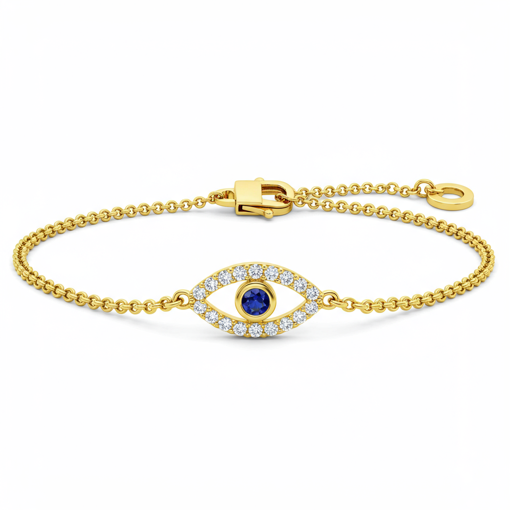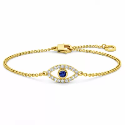 This exquisite Nazar Battu bracelet is a modern interpretation of ancient protective symbolism, crafted in radiant 18KT yellow gold. The centerpiece features a stylized evil eye motif, detailed with brilliant VVS diamonds and a rich sapphire pupil. Designed for comfortable daily wear, this piece elegantly balances spiritual meaning with contemporary high jewelry aesthetics. It serves as a sophisticated guardian, offering both protection and unparalleled style to the wearer. The adjustable chain ensures a perfect fit.