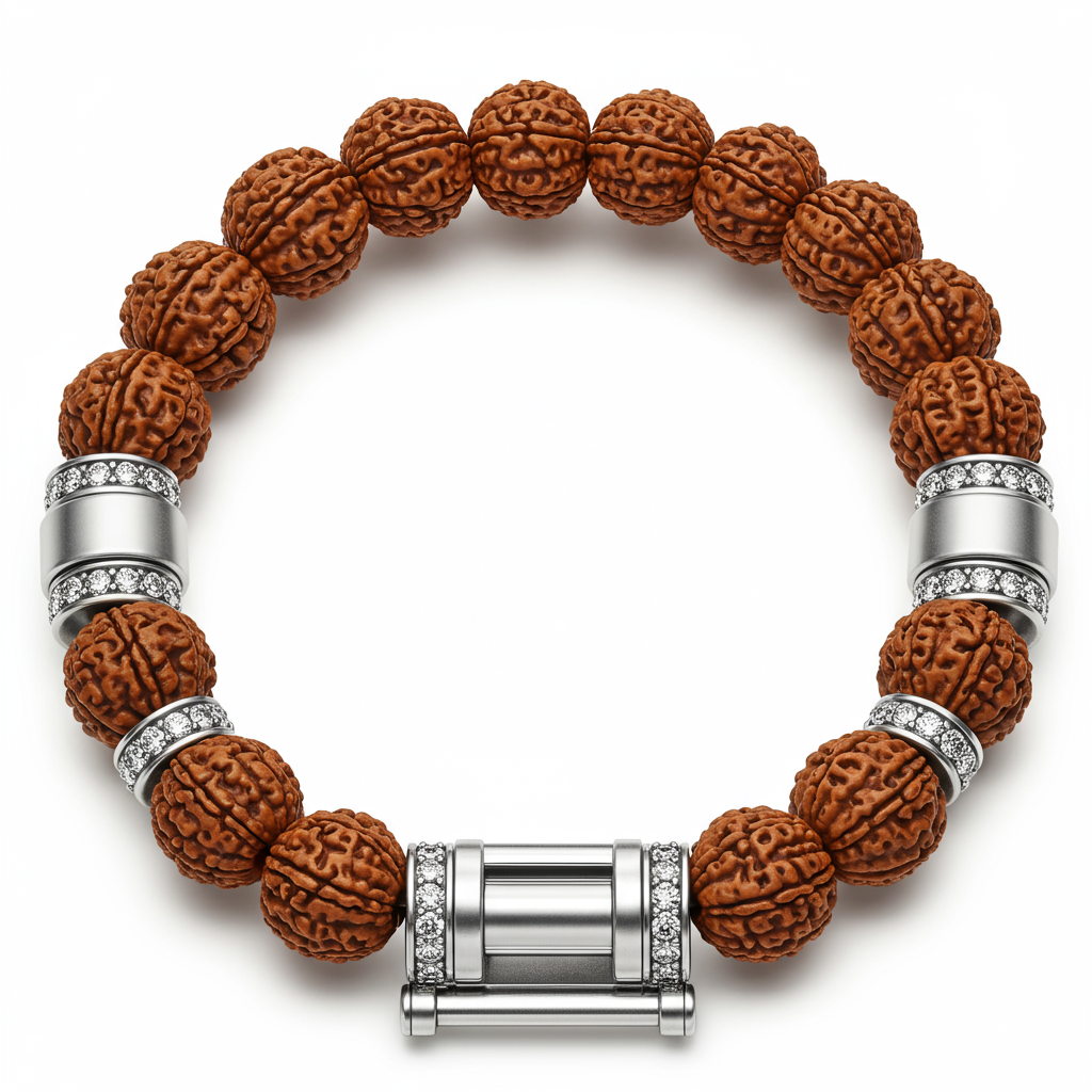 A masterful fusion of spirituality and modern luxury, this Silver Rudraksha Bracelet features authentic, sustainably sourced Rudraksha beads complemented by meticulously crafted sterling silver spacers and a secure clasp. The silver components are oxidized to enhance the deep, natural texture of the beads, creating a sophisticated contrast. Perfect for daily wear, this bracelet serves as a potent symbol of protection and calm, rendered with unparalleled craftsmanship. This designer piece balances traditional material with high-end subtle diamond detailing.
