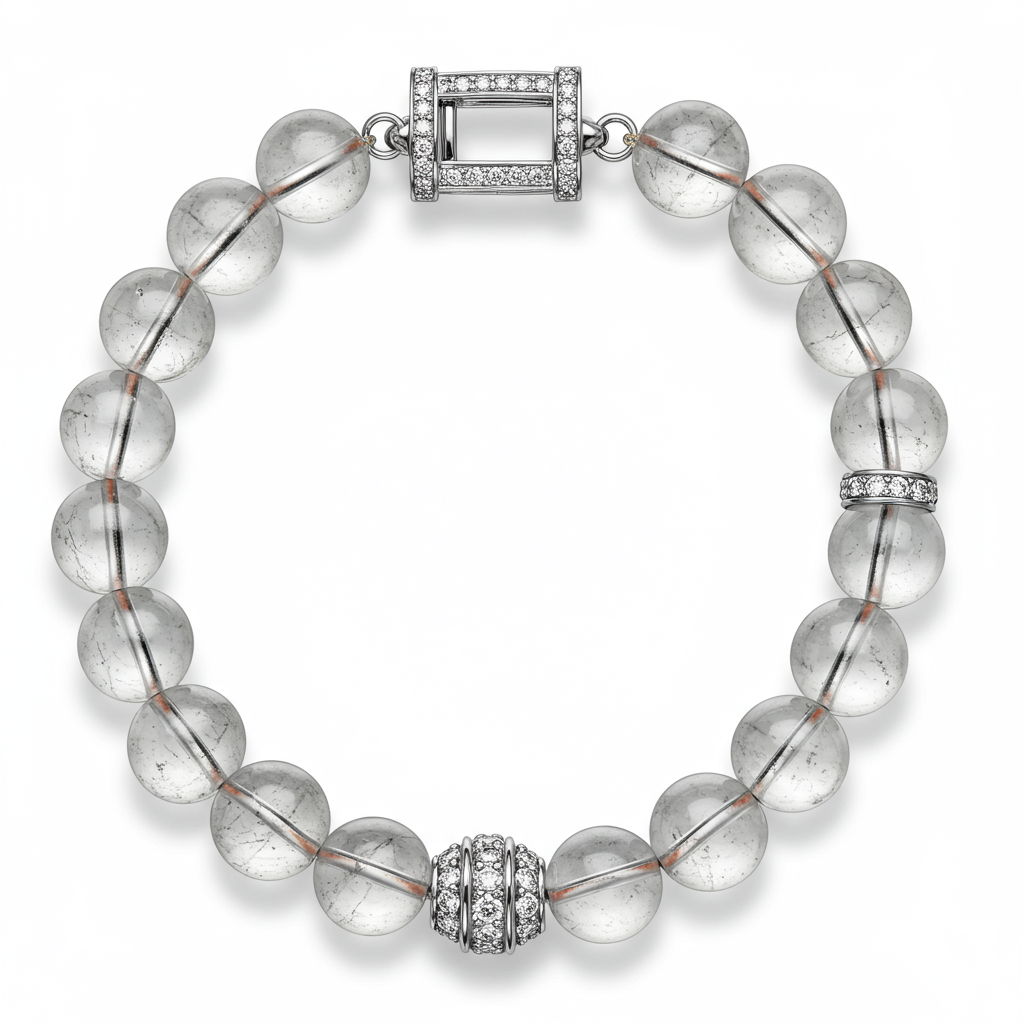 The Sphatik Purity bracelet captures timeless elegance through perfectly polished natural quartz beads. Believed to enhance clarity and spiritual energy, these flawless crystals are meticulously strung together, offering a soothing presence on the wrist. The contemporary clasp is crafted from luminous 18KT white gold, subtly accented with brilliant-cut diamonds for an elevated finish. This exquisite piece serves as a sophisticated statement accessory, blending traditional material significance with high-end contemporary design.