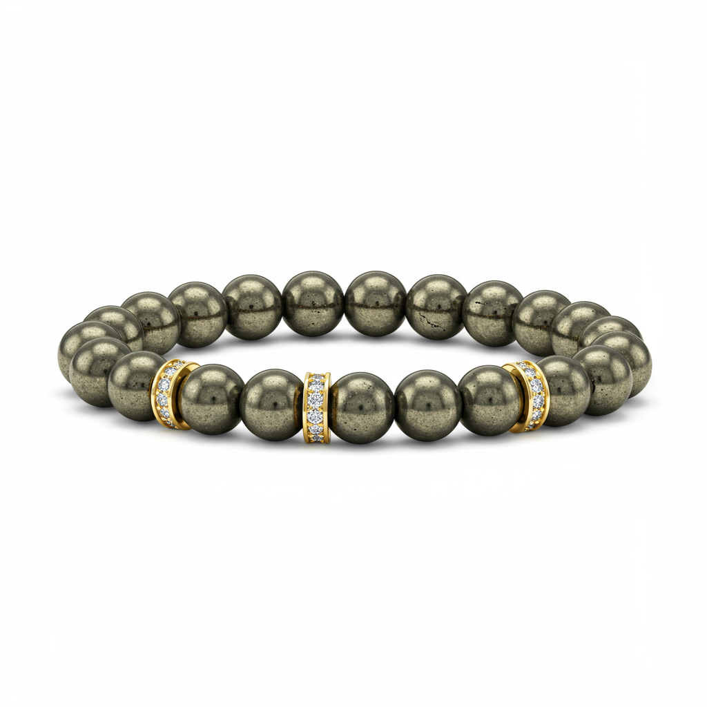 This exquisite stretch bracelet features perfectly polished, 6mm natural Pyrite beads, famed for their metallic luster and grounding properties. Subtle 18KT Yellow Gold spacers, meticulously set with VVS diamonds, punctuate the design, adding a touch of disciplined luxury. Pyrite, often called 'Fool's Gold,' is associated with strength and protection, offering aesthetic beauty alongside rumored metaphysical benefits. This piece merges high-carat elegance with powerful natural energy, creating a distinctive everyday accessory.